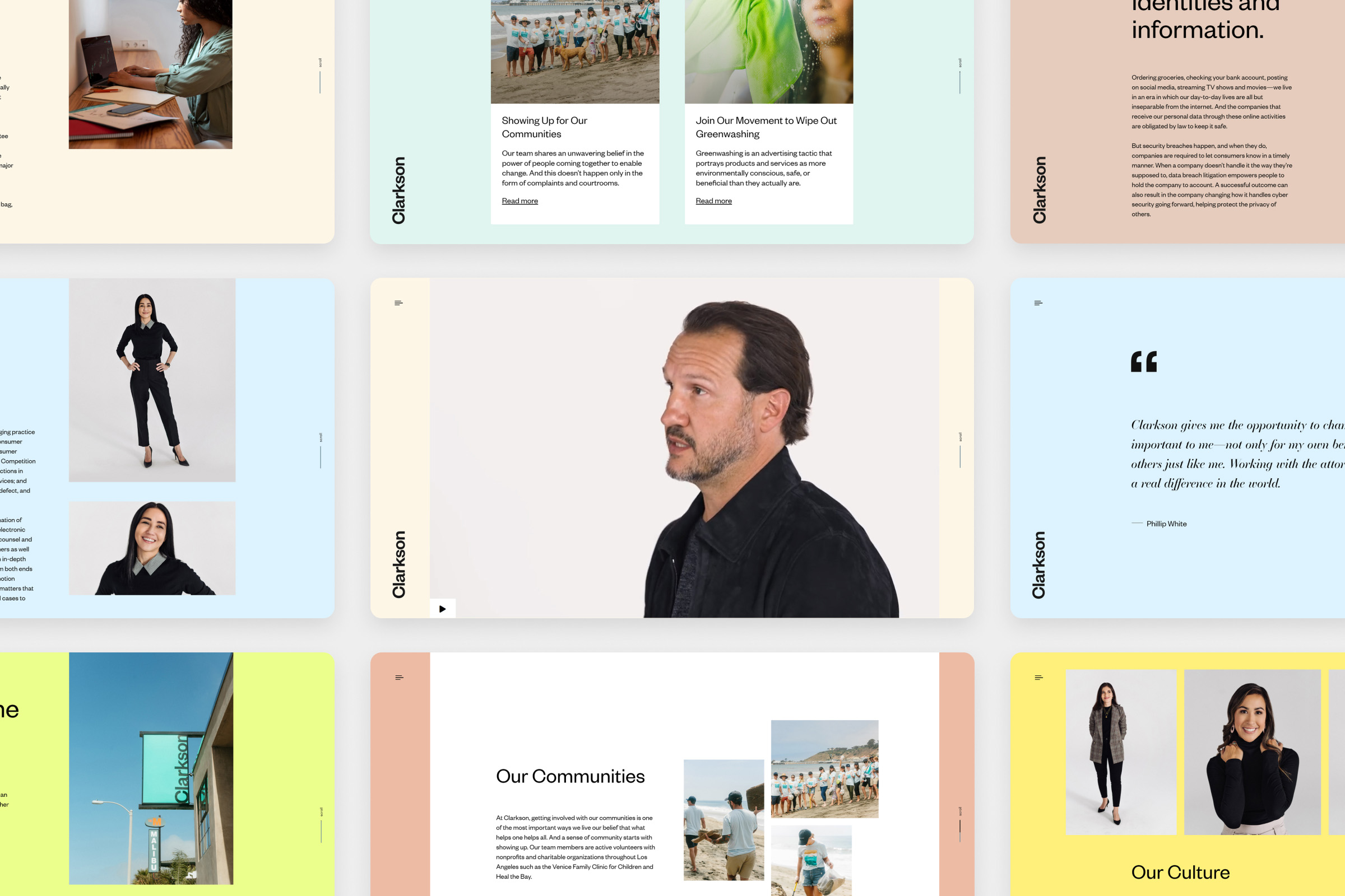 Clarkson's website was developed to be fresh, colorful, and vastly different from the boring traditional law firm website. We pushed the boundaries with aesthetic layouts, typographic treatments, dynamic hues, and distinct imagery.